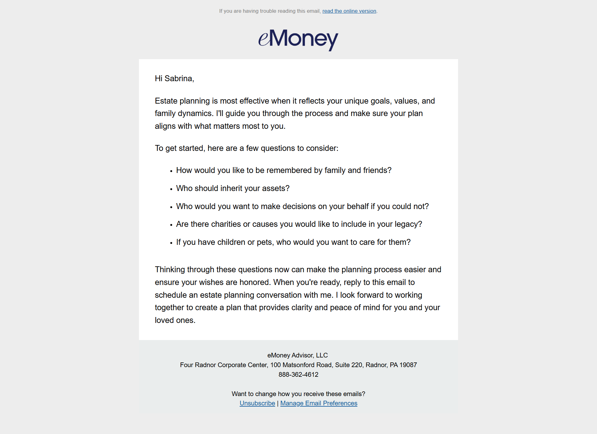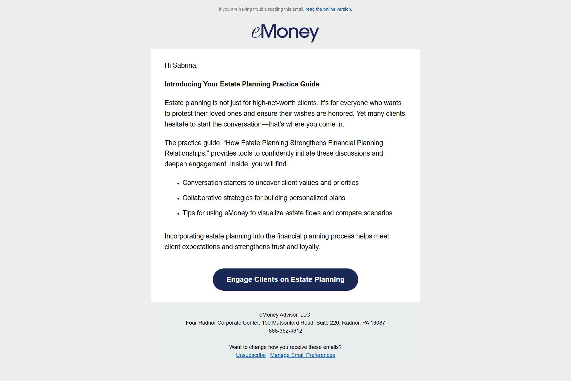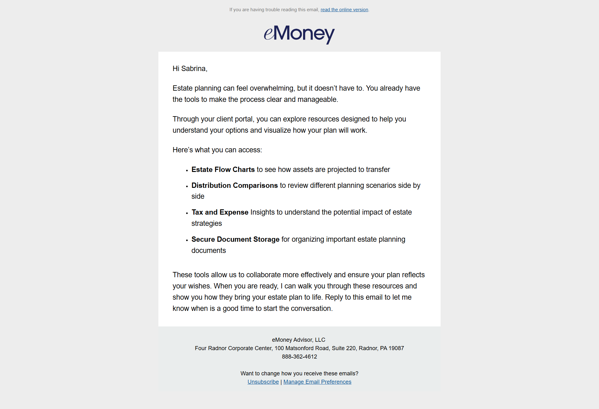 This email template helps advisors deliver more consistent, personalized guidance at scale—one of the top opportunity areas identified in the eMoney Study: Value of Financial Planning (November 2025). It spotlights Presentation View within Decision Center, featuring a new blog post on how advisors can use the feature to deliver a…