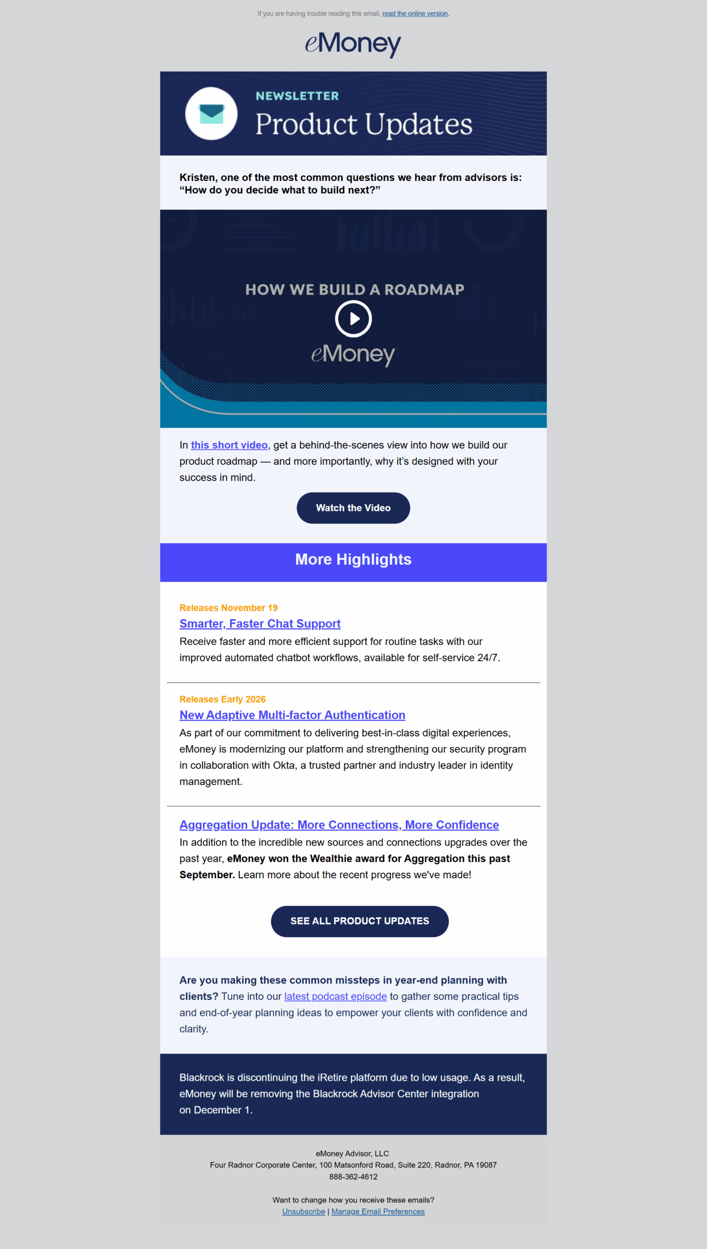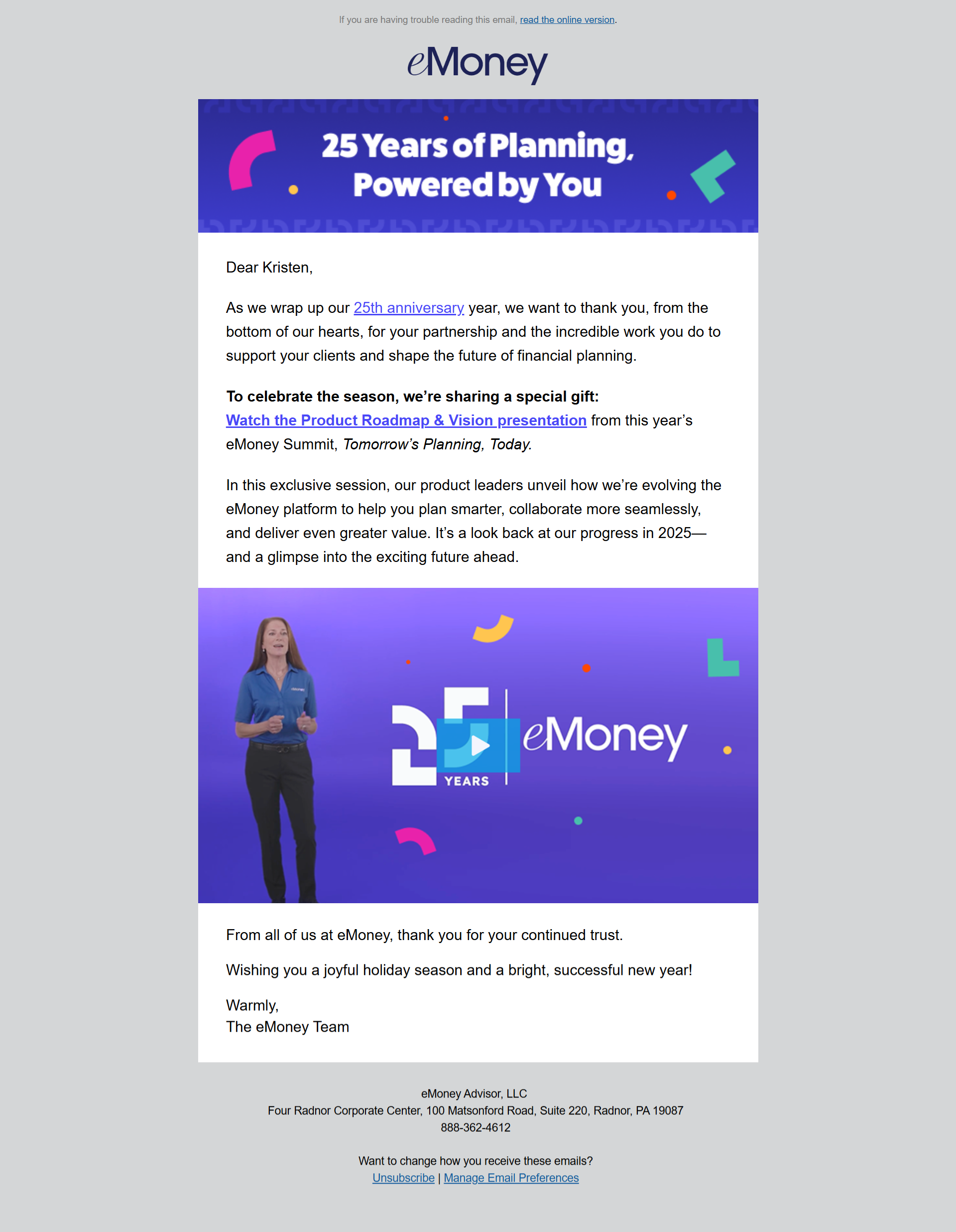 As we close out eMoney’s 25th anniversary year, share this email with your advisors celebrating the end of 2025 which includes this exclusive roadmap and vision presentation to reinforce how their feedback drives innovation. In this exclusive Product Roadmap & Vision presentation from the eMoney Summit, our leaders reveal…