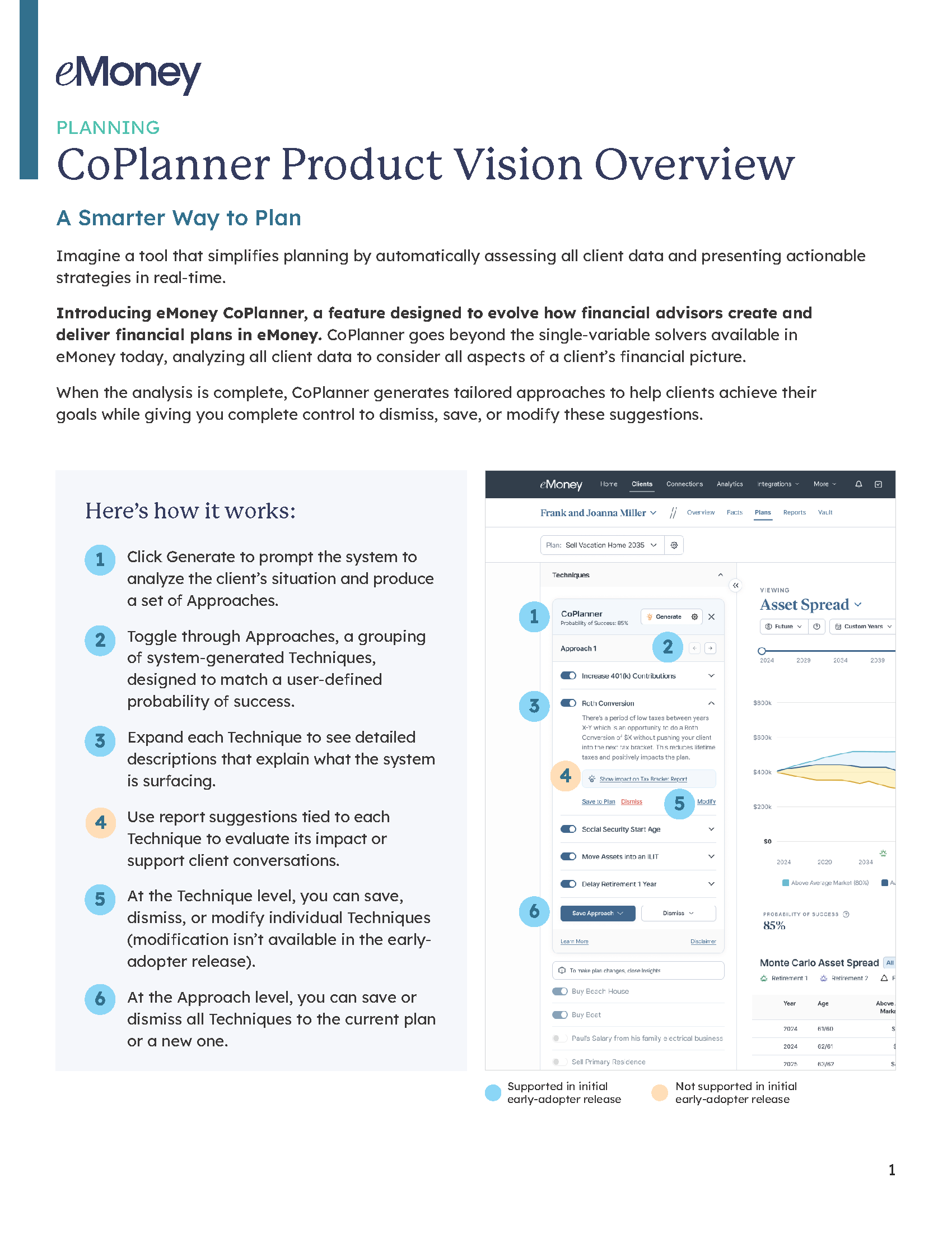 This detailed overview explains how CoPlanner analyzes client data and existing plans using a structured, rules‑based framework. It shows how CoPlanner evaluates a wide range of retirement, savings, insurance, tax, and estate techniques, including or excluding each one based on qualifying criteria, client demographics, and its impact on Probability of…